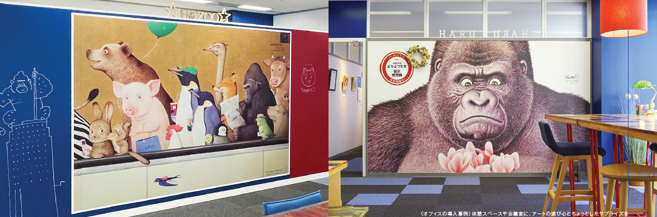 かわいらしい動物たちが迎えてくれるウォールアートは、空間に遊び心やあたたかさを加え、居心地の良い雰囲気を生み出します。オフィスや施設のブランディング強化にもつながることから、導入されたオフィスでは会議室や休憩スペースでのコミュニケーション活性化にも効果が見られています。