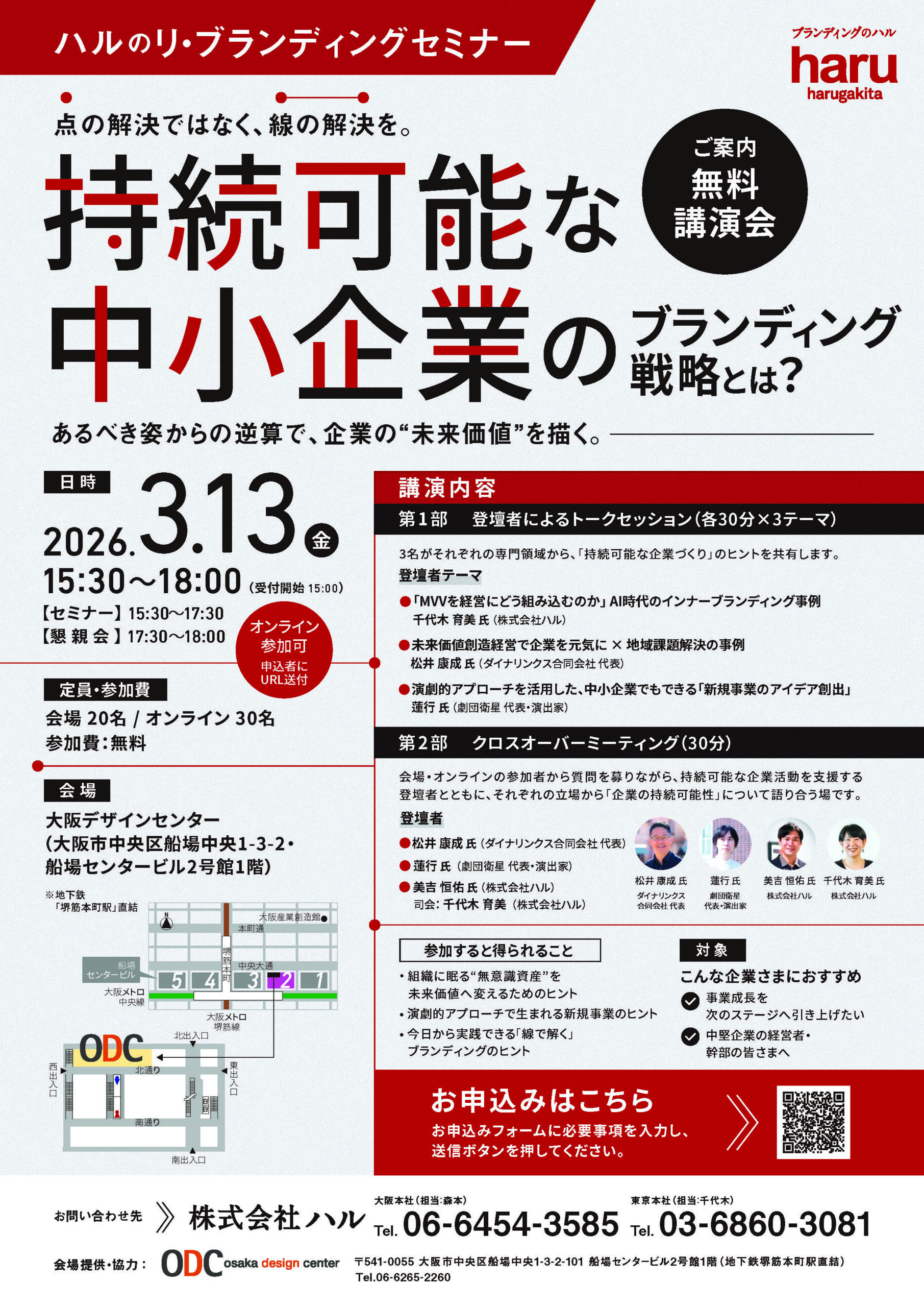 2026年3月13日(金)、大阪デザインセンターにてハル主催のセミナーを開催します。「【ハルのリ・ブランディングセミナー】持続可能な中小企業のブランディング戦略とは?」と題して、次なる成長ステージに進もうとしている中堅企業さま向けに、2部構成で実施します。持続可能な企業づくりにつながるブランディングアプローチをご紹介します。参加費は無料ですので、ぜひご参加ください。