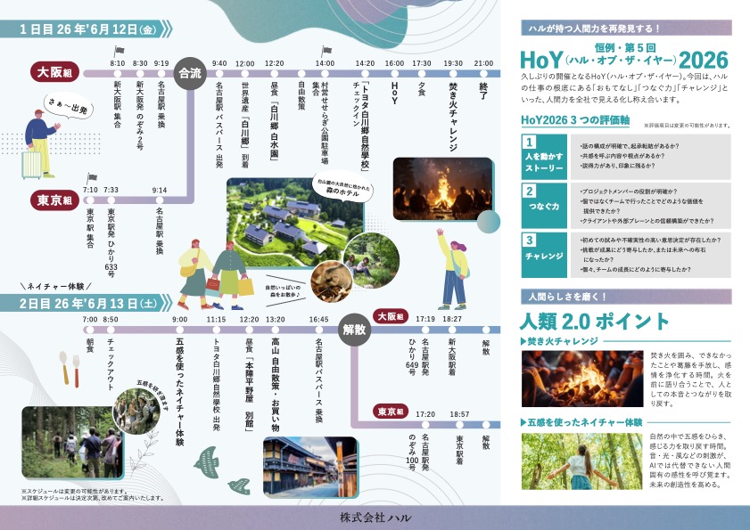 「AI 時代に人間力を磨く。」ハルの社員研修旅行2026・6月 トヨタ白川郷自然學校