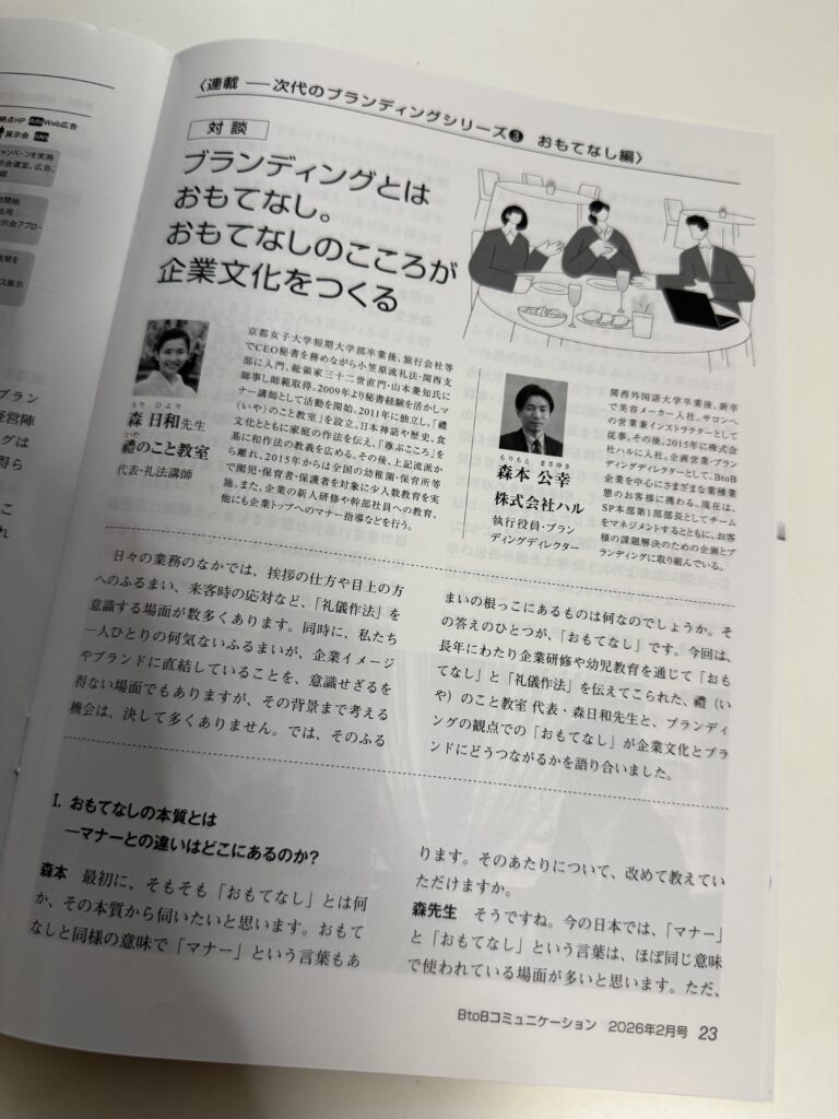 今回は、長年にわたり企業研修や幼児教育を通じて「おもてなし」と「礼儀作法」を伝えてこられた、禮(いや)のこと教室代表・森日和先生と、ブランディングの観点での「おもてなし」が企業文化とブランドにどうつながるかを語り合いました。