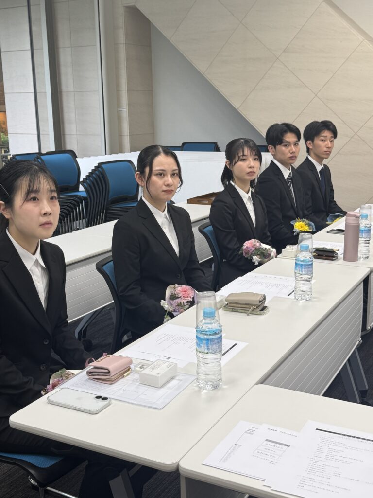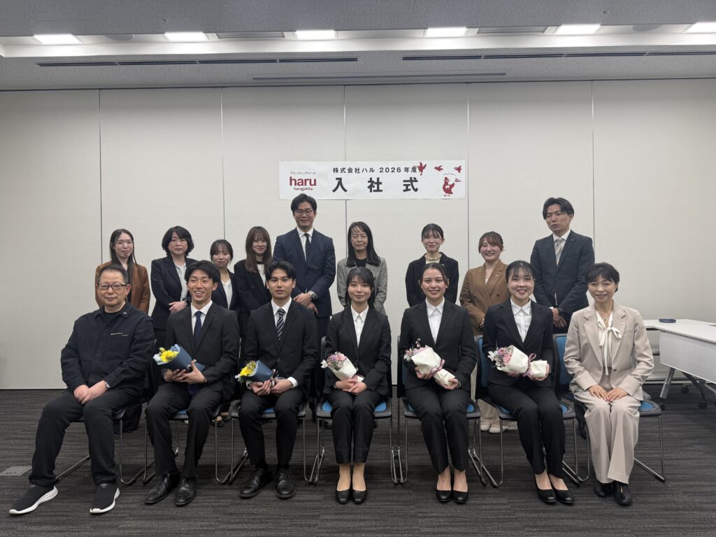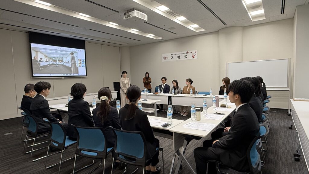 ハル大阪本社のある梅田ダイビルの地下1階会議室にて、2026年度の入社式を執り行いました。式には越智賢三会長、中村あつ子社長、取締役の美吉常務などが出席し、下記の内容で和やかに執り行われました。