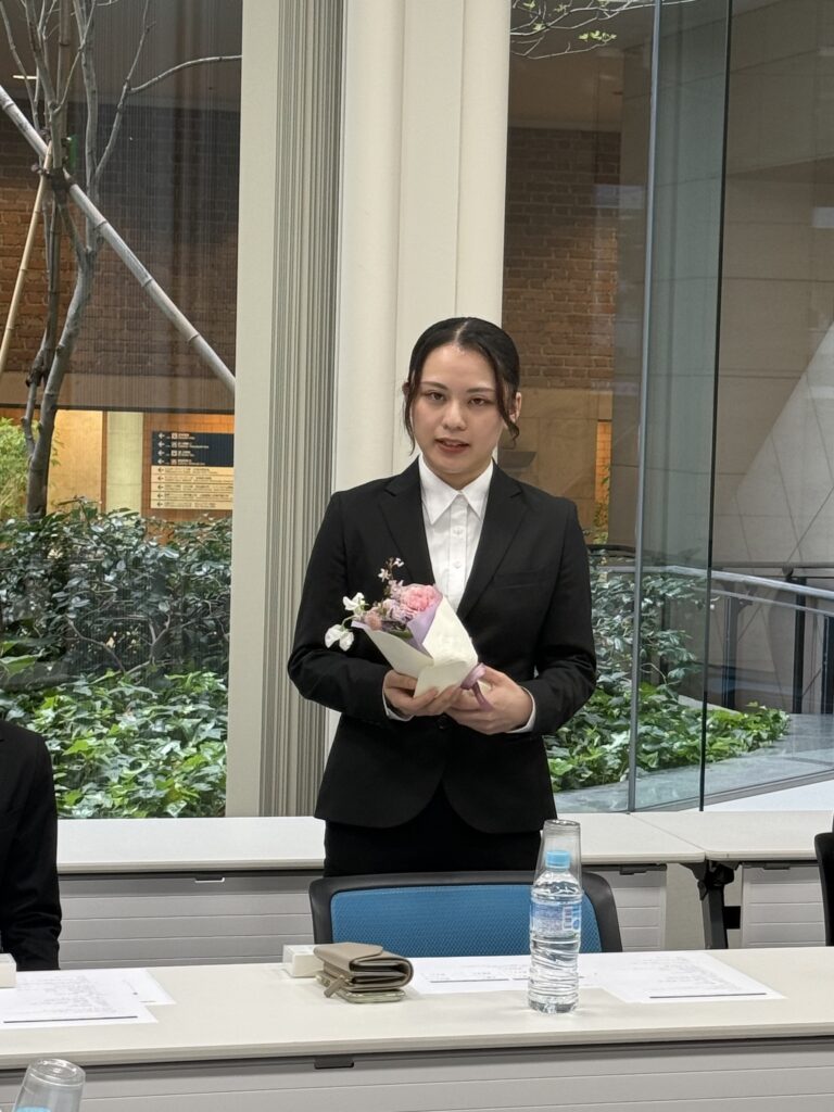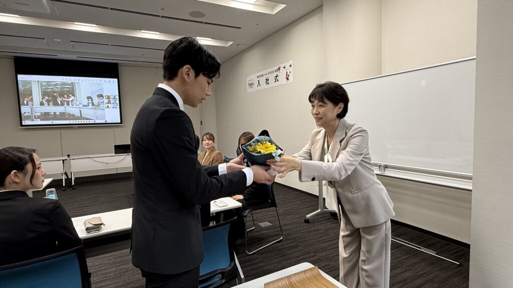 中村社長の挨拶の後、社長から新入社員へ花が贈られました。