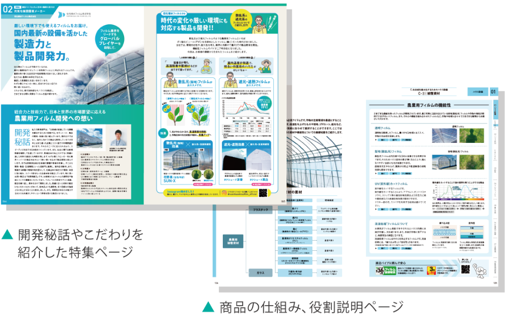 特集2では、カタログ掲載メーカーさまの中から、11社をピックアップ。商品の開発秘話や上手な使い方、夏の猛暑対策など、農家さまの日々の課題を解決するための方法や、お役立ち情報を盛り込んだ。一方、本編のカタログ冒頭では、商品の選定基準となる仕組みや役割説明のページを設け、メーカーさまの専門的な知見を拝借。渡辺パイプとハウス設備メーカーさまの共創がカタチとなった。